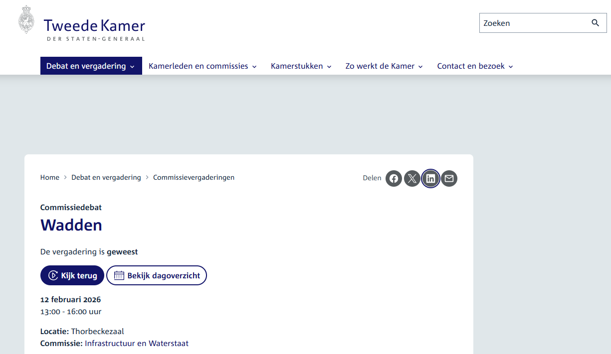 De link naar agenda en kamerstukken: Waddenzeebeleid | Tweede Kamer der Staten-Generaal